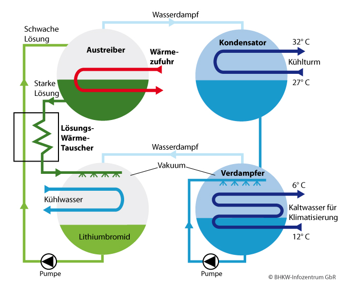 Soğutma ve çözeltme devrelerinde istenilen soğukluğa göre, örneğin; 6/12 C derece soğutma alanı için, soğutucu madde olarak su, çözeltici madde olarak Lityumbromid kullanılır.